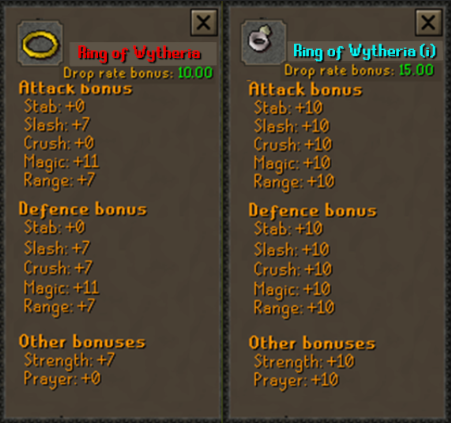 Below you can compare the stats of both the Ring of Wytheria unimbued and imbued, and ways of accessing the components to make one for yourself.